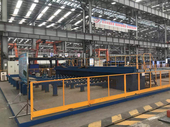 該設(shè)備主要由龍門(mén)綜合拼板架、物流傳送系統(tǒng)、焊接系統(tǒng)、數(shù)據(jù)監(jiān)控系統(tǒng)、集中潤(rùn)滑系統(tǒng)、電氣控制系統(tǒng)、坡口機(jī)、焊接小車(chē)及電源和檢修機(jī)位手弧焊電源等組成,設(shè)備整體區(qū)域范圍10m*20m。采用正面液壓琴鍵壓緊、反面加水冷銅套襯墊成型槽的方式進(jìn)行拼板對(duì)接焊接,采用雙絲氣保焊工藝,實(shí)現(xiàn)工件單面焊雙面成型。此單面焊雙面成型焊接工藝避免了傳統(tǒng)的兩面焊工件翻身問(wèn)題,節(jié)省場(chǎng)地,降低作業(yè)強(qiáng)度,提高了焊接效率,實(shí)現(xiàn)流水線(xiàn)焊接,該拼板單面自動(dòng)化焊接工作站各部分之間可協(xié)調(diào)動(dòng)作,采用PLC可編程序控制器集中控制方式,整體設(shè)計(jì)緊湊,自動(dòng)化程度高,便于操作。輔助機(jī)構(gòu)配置齊全,可充分發(fā)揮整機(jī)的性能。