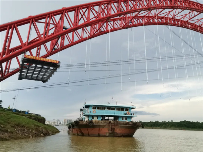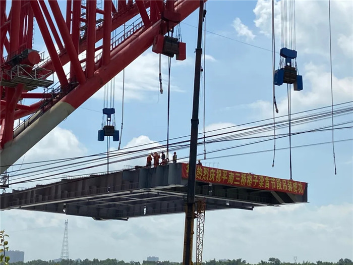 7月4日上午,由中國(guó)船舶武船集團(tuán)武船重工股份承建的世界第一大跨度鋼管拱橋――平南三橋再次迎來關(guān)鍵節(jié)點(diǎn),格子梁首節(jié)段(北岸PHL04N)精準(zhǔn)落位,吊裝成功,線型和標(biāo)高全部滿足設(shè)計(jì)規(guī)范要求,標(biāo)志著大橋正式進(jìn)入橋面梁施工階段。