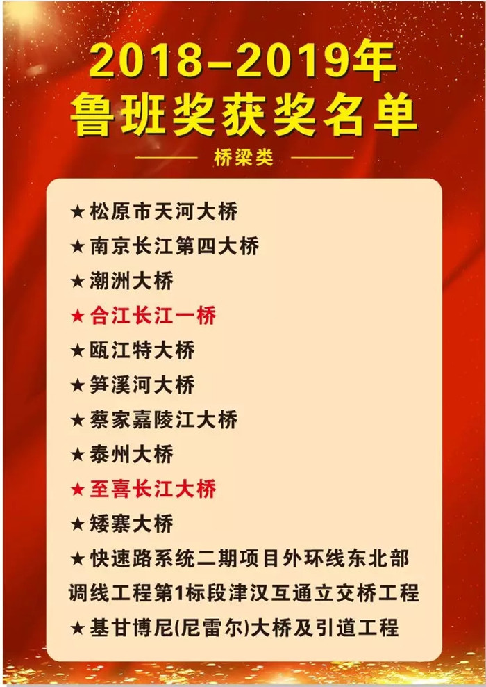 12月10日,建筑業(yè)科技創(chuàng)新暨2018-2019年度中國(guó)建設(shè)工程魯班獎(jiǎng)(國(guó)家優(yōu)質(zhì)工程)表彰大會(huì)在北京舉行,共241項(xiàng)工程獲獎(jiǎng),武船重工股份承建的宜昌至喜長(zhǎng)江大橋、四川合江長(zhǎng)江一橋榜上有名。
