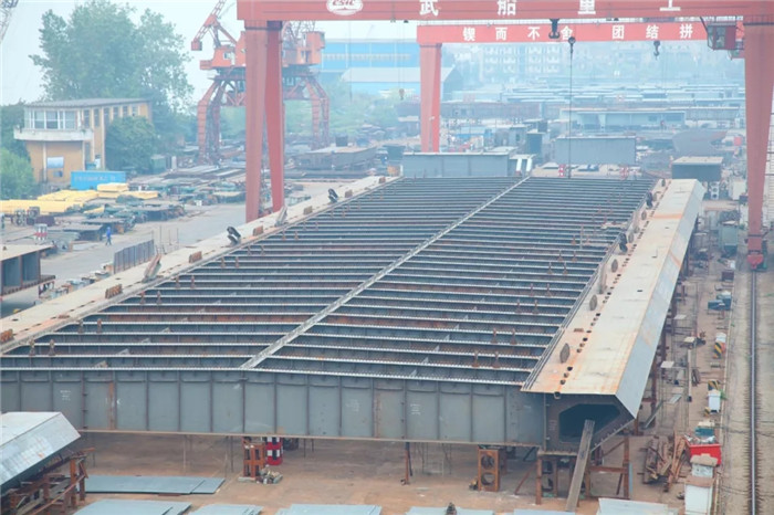 武船重工股份于2010年3月簽訂該橋建造合同,承擔(dān)了該橋鋼拱肋、橫撐、橋面格子梁、橋面板等在內(nèi)的鋼結(jié)構(gòu)加工制造、預(yù)拼裝、現(xiàn)場(chǎng)安裝等工作,總用鋼量1.16萬(wàn)噸。