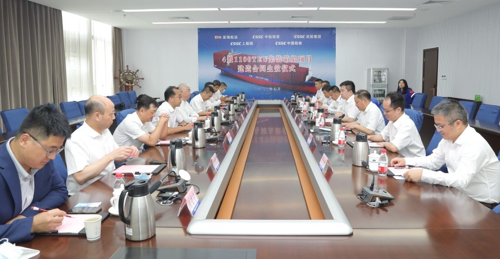 7月7日,中國船舶武船與CA SHIPPING(中船租賃和亞海航運成立的合資公司)簽署的4艘1100TEU集裝箱船項目合同生效儀式在武船總部舉行。這是公司繼此前交付的2艘700TEU集裝箱船后承接的又一支線集裝箱船訂單,為公司深耕支線集裝箱船市場,實現(xiàn)批量化、專業(yè)化建造奠定堅實基礎。
