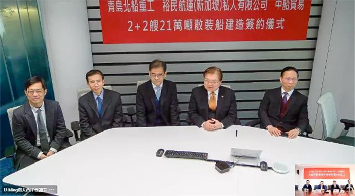 1月29日,中國(guó)船舶工業(yè)貿(mào)易有限公司、武船集團(tuán)北船重工與裕民航運(yùn)股份有限公司在青島、臺(tái)北兩地,通過視頻形式舉行了2+2艘21萬噸散貨船項(xiàng)目云簽約儀式。這是繼32.5萬噸礦砂船項(xiàng)目后又一次重大戰(zhàn)略合作,充分體現(xiàn)了船東給予的認(rèn)可和支持!