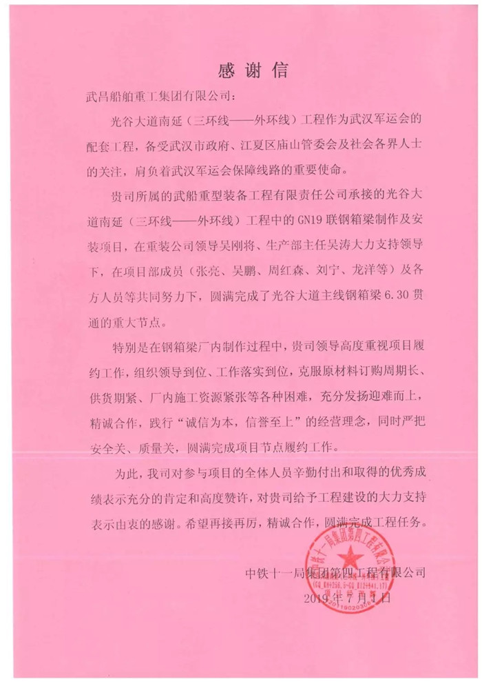 光谷大道南延(三環(huán)線?C?C外環(huán)線)工程作為武漢軍運(yùn)會(huì)的配套工程,備受武漢市政府、江夏區(qū)廟山管委會(huì)和社會(huì)各界人士的關(guān)注,并肩負(fù)著武漢軍運(yùn)會(huì)保障線路的重要使命。武船集團(tuán)重裝公司承接的光谷大道南延(三環(huán)線?C?C外環(huán)線)工程中的GN19聯(lián)鋼箱梁制造及安裝任務(wù),結(jié)構(gòu)重量3347噸,共計(jì)82個(gè)節(jié)段,在各方人員共同努力下,圓滿完成了光谷大道主線鋼箱梁貫通的重大節(jié)點(diǎn)。特別是在鋼箱梁廠內(nèi)制作過(guò)程中,重裝公司高度重視項(xiàng)目節(jié)點(diǎn)履約工作,組織領(lǐng)導(dǎo)到位、工作落實(shí)到位,克服了原材料訂購(gòu)周期長(zhǎng)、供貨期緊、廠內(nèi)施工資源緊張等各種困難,充分發(fā)揚(yáng)迎難而上,精誠(chéng)合作,踐行“誠(chéng)信為本,信譽(yù)至上”的經(jīng)營(yíng)理念,同時(shí)嚴(yán)把安全關(guān)、質(zhì)量關(guān),圓滿完成項(xiàng)目節(jié)點(diǎn)履約工作。