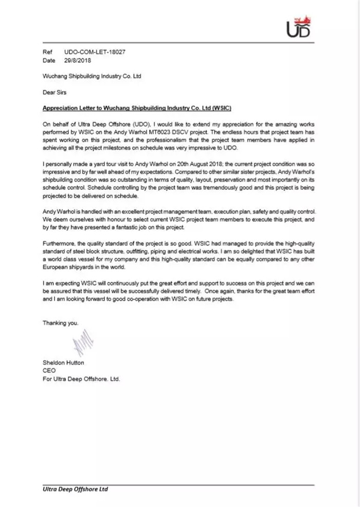 近日,特發(fā)來表揚信以表達對武船的認可及感謝。
