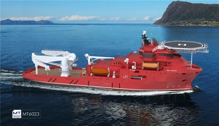 MT6023 深潛水工作支持船入DNV船級社,集飽和潛水支持、油田守護、浮油回收、ROV、DP2、FIFI2等功能于一體。船上將配備1臺150噸海工吊,具有升沉補償功能;1套18人飽和潛水系統(tǒng),最大工作深度為300米;2套ROV裝備,可在3000米水深工作。