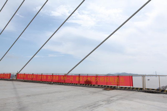 臺(tái)州灣大橋主橋?yàn)橹骺?88米的雙塔雙索面疊合梁斜拉橋,全長(zhǎng)948米,是臺(tái)州沿海高速公路的控制性工程,它的順利合龍,標(biāo)志著大橋主體工程建設(shè)已進(jìn)入收官階段。