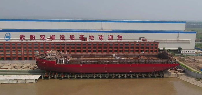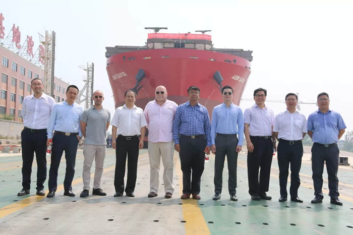 7月24日上午10時18分,烈日炎炎,彩旗飄動,由雙柳武船承建的13000DWT甲板運輸船最后一艘4號船在雙柳基地下水。船東代表法國路易達孚海運集團公司艾米力?杜,武昌船舶重工集團有限公司副總經(jīng)理田軍,武船集團雙柳武船黨委書記、董事長楊國平等參加了下水儀式。4號船的順利下水,標(biāo)志著在雙柳武船全體員工努力下,在設(shè)計師、工程師和驗船師的積極幫助下,13000DWT項目進入全面收官的關(guān)鍵沖刺階段。