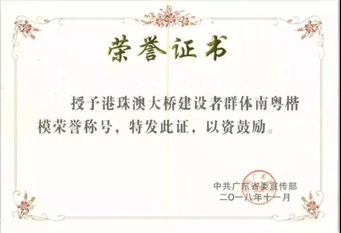 11月3日,廣東省委宣傳部授予港珠澳大橋建設(shè)者群體 “南粵楷?!狈Q號(hào)。廣東省委常委、宣傳部部長傅華出席活動(dòng),并會(huì)見了港珠澳大橋建設(shè)者代表。