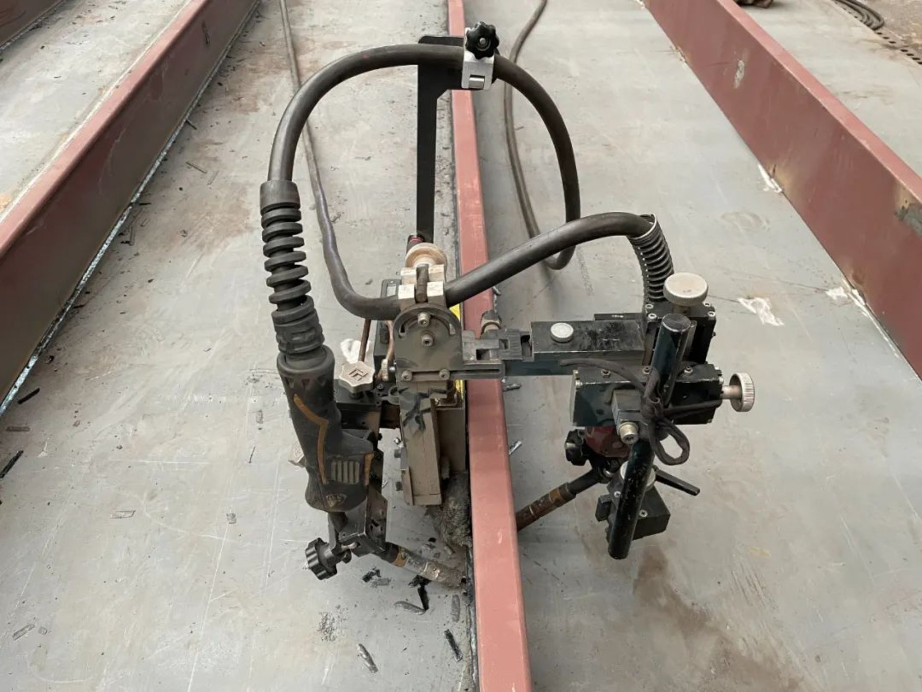 在甲板型材結構上的開孔,會影響角焊小車無法連續(xù)施焊,需事后人工進行修補。經過集思廣益,大家對角焊小車設備進行了簡易改裝,改變其行走限位輪的高度,保證了角焊小車在行進過程中的連續(xù)性,省去了后期人工補焊、打磨等工時的消耗。”