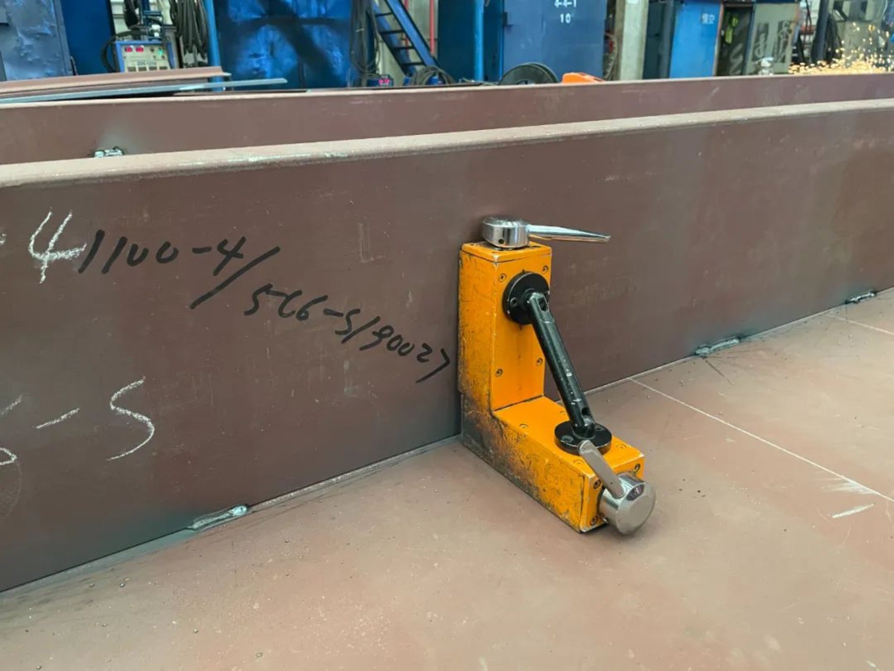 無碼工裝的使用,一直是提高配質量和生產效率的有效手段。分段部通過磁力壓碼、磁力頂碼的使用,利用磁力支架,方便對甲板型材、T型材等結構垂直度進行調整,實現拼板、甲板型材、T型材等結構的無碼裝配,節(jié)省了后續(xù)割、補、磨等無效工時,同時避免外板點焊及過度打磨留下弧坑,有效提升分段外板和整船船體外觀質量。