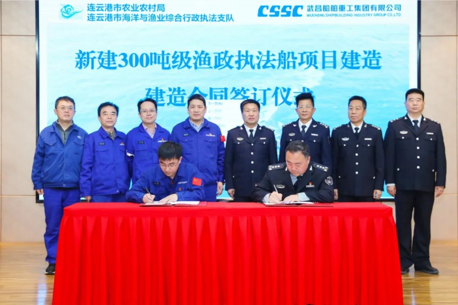 連云港市農(nóng)業(yè)農(nóng)村局副局長楊建瑞、連云港市農(nóng)業(yè)農(nóng)村局漁政處處長李海、連云港市海洋與漁業(yè)綜合行政執(zhí)法支隊支隊長張長春等領(lǐng)導,武昌造船黨委委員、總會計師陳仲明,經(jīng)營部和船艇公司共同見證簽約。