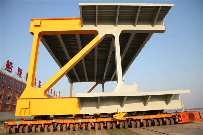 上午10時(shí),首節(jié)鋼桁梁經(jīng)過(guò)完整報(bào)檢,駐場(chǎng)監(jiān)理確認(rèn)后,由56軸線并聯(lián)的模塊車緩緩頂起,轉(zhuǎn)運(yùn)到斜船架指定位置。