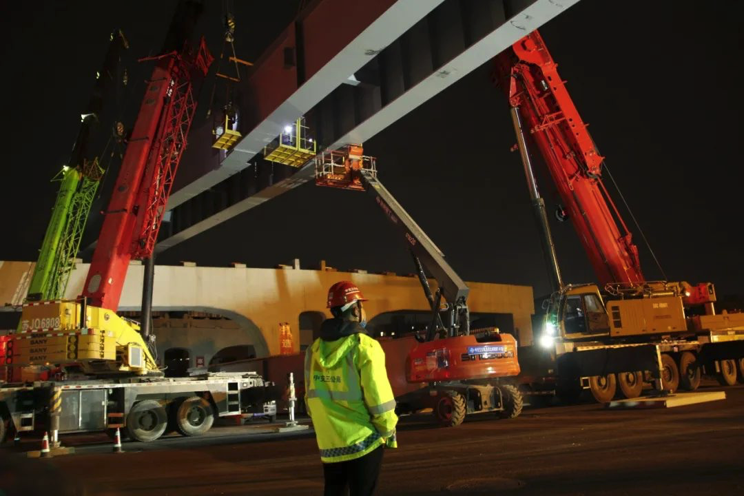 ▲最后一片鋼板梁正在吊裝