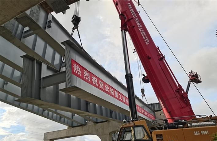 8月16日下午17時許,隨著最后一片鋼板梁成功吊起,在兩臺起重機(jī)的默契配合下,穩(wěn)穩(wěn)地落在兩端支座之上,并對孔成功,由中國船舶武船集團(tuán)武船重工股份承建的臺州路澤太高架TJ01標(biāo)段鋼板梁全部架設(shè)完成。