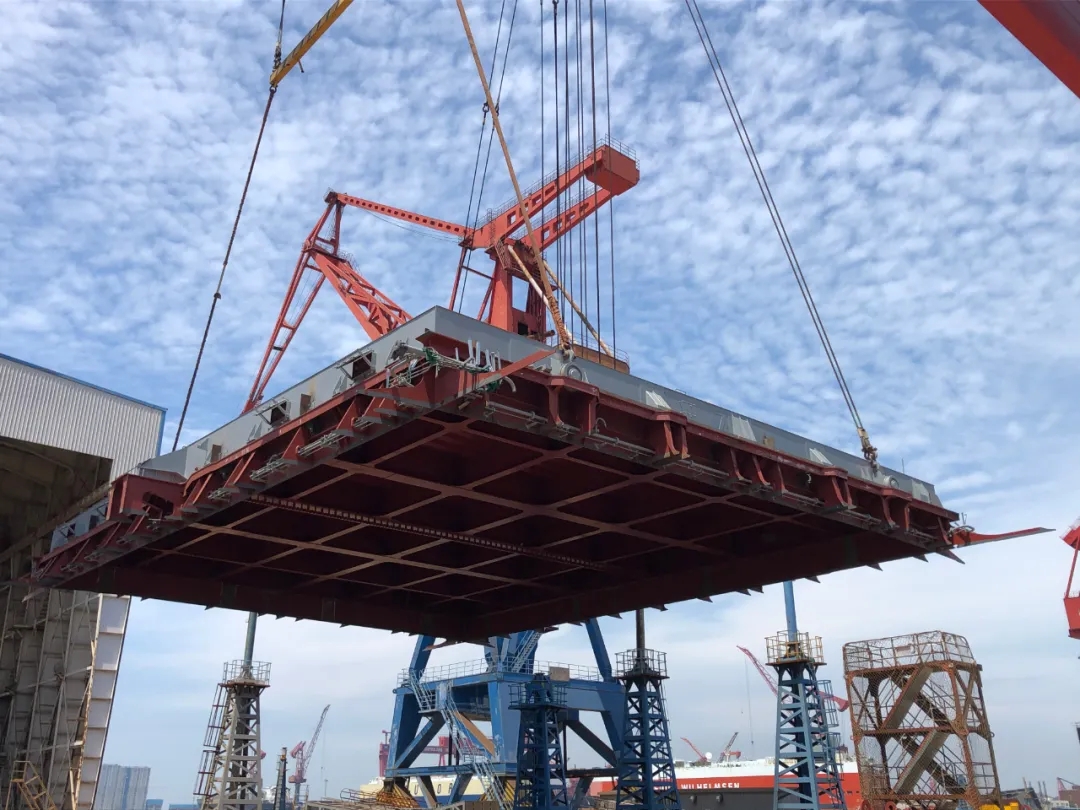 7月4日,武船集團(tuán)北船重工在建的32.5萬噸系列礦砂船11號(hào)船七號(hào)貨艙艙口圍分段連同艙口蓋順利完成一體化塢內(nèi)搭載吊裝作業(yè)。這是繼10號(hào)船四號(hào)貨艙艙口圍分段無艙蓋整體吊裝后的第二次技術(shù)迭代,標(biāo)志著武船集團(tuán)北船重工攻克了艙口圍一體化建造吊裝方案、精度控制、地面調(diào)試等主要難關(guān),在實(shí)施工序前移、提高艙口圍分段舾裝完整性等精細(xì)化管理實(shí)踐中再獲突破。