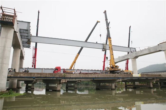 圖為5月30日,第一根鋼梁正在架設(shè)中