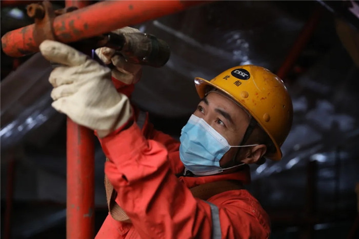 ▲21:30,某產(chǎn)品機(jī)艙里,年輕管工師傅艱難地爬進(jìn)狹縫里,準(zhǔn)備焊接管件