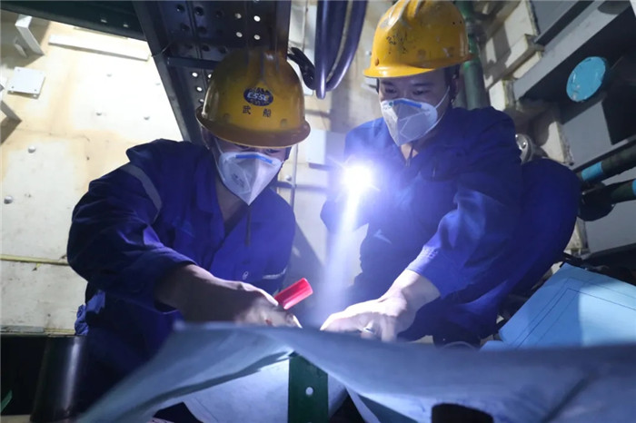 ▲19:37,某產(chǎn)品機(jī)艙,兩名年輕的管工師傅正在查看圖紙,由于機(jī)艙太過狹小,他們只能全程蹲著