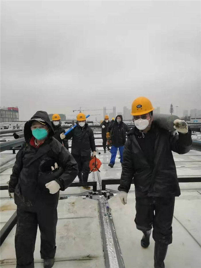 △雷神山醫(yī)院頂樓天臺(tái)現(xiàn)場(chǎng)冒雨施焊接作業(yè)