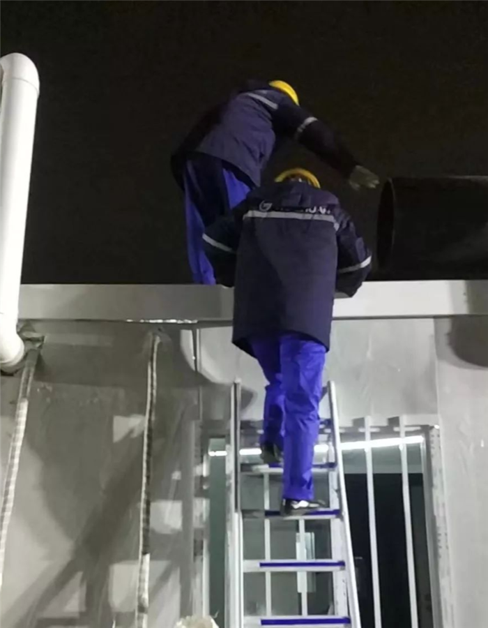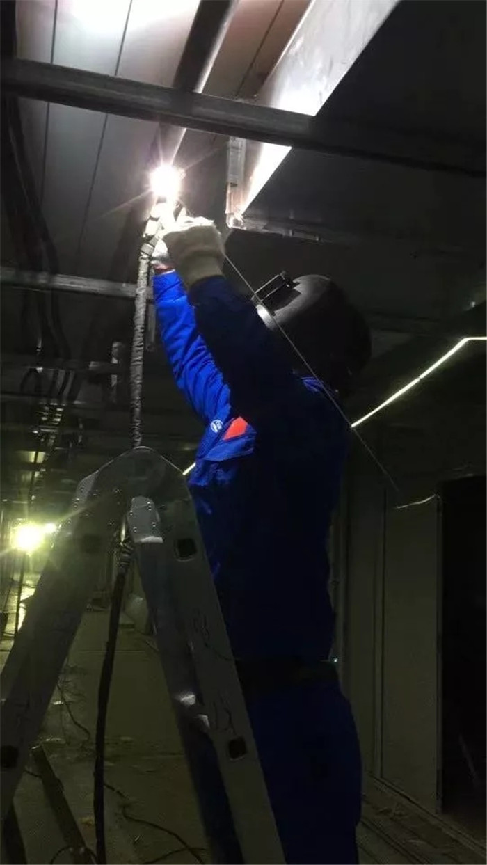 焊接時(shí),大家發(fā)現(xiàn)這里的所有管件都沒(méi)有坡口,且裝焊時(shí)需要踩著梯子、抬著管子、仰著頭,卡在風(fēng)管和電纜中間僅20-30cm的間隙內(nèi)操作,但這些對(duì)于“久經(jīng)沙場(chǎng)”的軍工師傅們來(lái)說(shuō)真的不值一提。