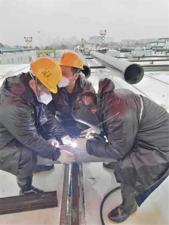 “雷神山頂樓天臺(tái)A6、A8區(qū)域供氧管路,共由300余米直徑110mm主管、600余米直徑48mm、89mm支管及少量三通管件組成。2月5日晚下了一場(chǎng)大雨,造成天臺(tái)積水。2月6日清晨,我們施工時(shí),天空仍飄著淅淅瀝瀝的小雨,還伴著2-3級(jí)的東北風(fēng),這些環(huán)境因素主要給我們的焊接工作造成了一定程度上的影響?!标愋≤娊榻B道。