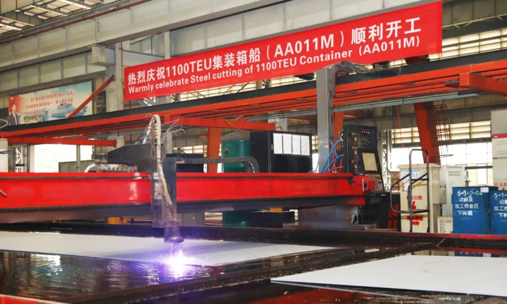 5月17日11時(shí)18分,武昌造船為希臘船東Cosmoship建造的1100TEU集裝箱船首制船在雙柳廠(chǎng)區(qū)順利開(kāi)工。船東代表、BV船級(jí)社、中船貿(mào)易相關(guān)領(lǐng)導(dǎo)及公司相關(guān)部門(mén)代表、產(chǎn)品三總師參加開(kāi)工儀式。