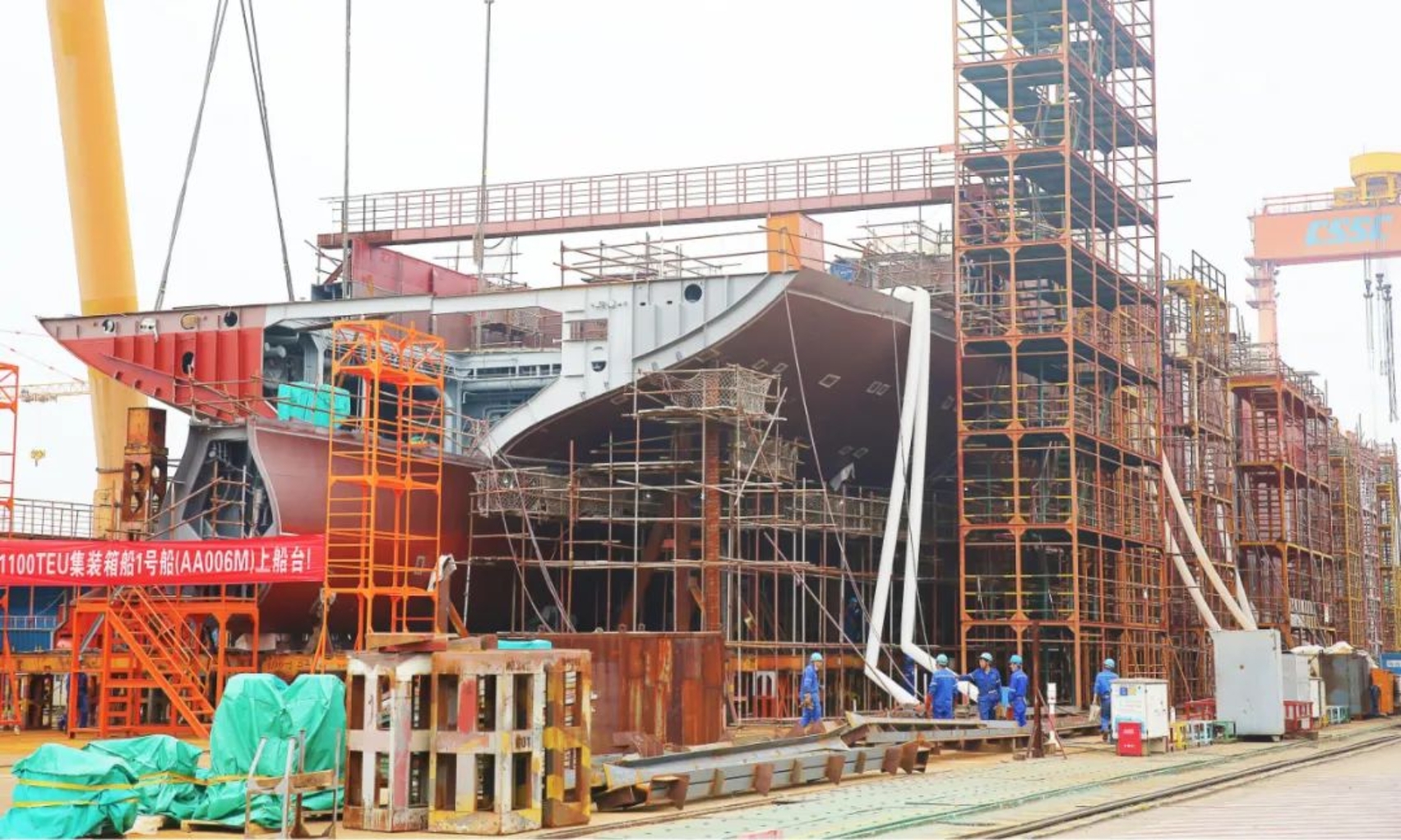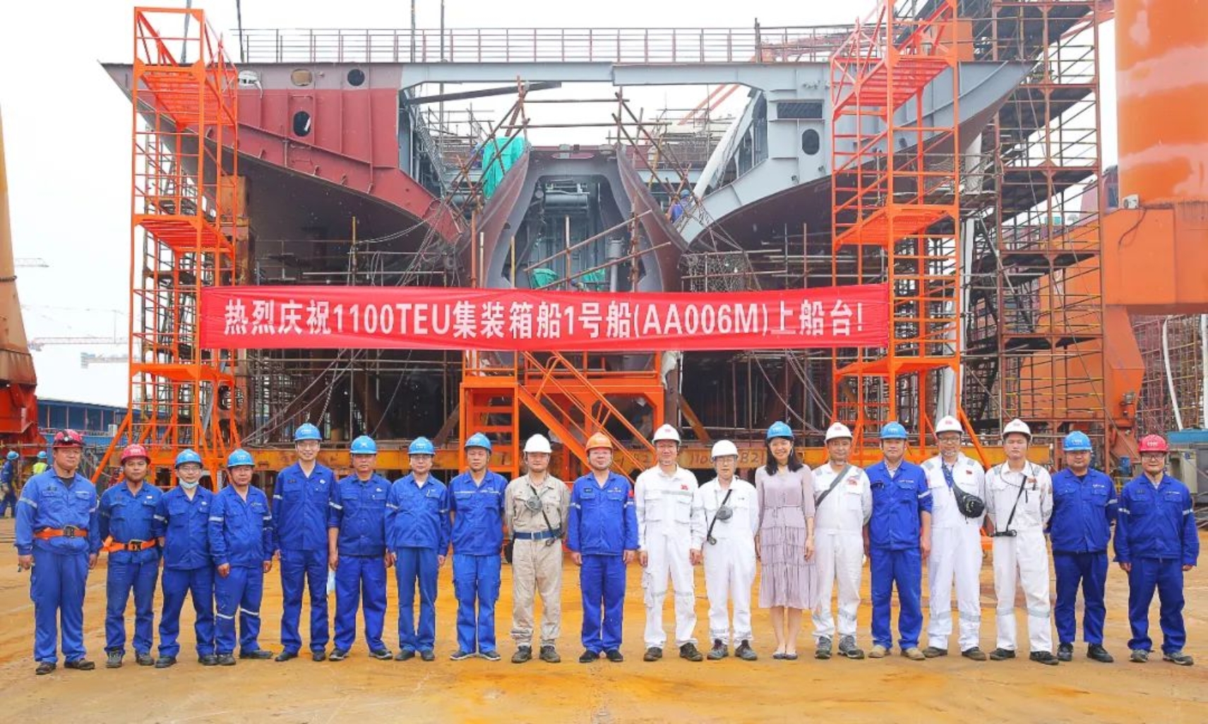 5月16日上午11時(shí)18分,武昌造船為CA Shipping建造的1100TEU集裝箱1號(hào)船在雙柳廠(chǎng)區(qū)順利上船臺(tái),在船舶完整性良好的前提下實(shí)現(xiàn)計(jì)劃節(jié)點(diǎn)提前9天完成。