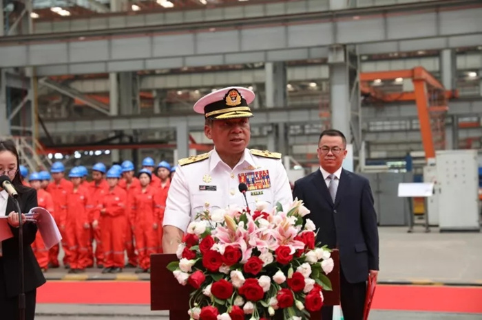 中船重工副總經(jīng)理何紀(jì)武、馬來西亞皇家海軍司令卡瑪魯扎曼上將赴開工現(xiàn)場并致辭??ì旚斣?,何紀(jì)武,莫實德船廠總裁拉姆利,國防科工局軍貿(mào)與外事司副巡視員馬衛(wèi)華,中船重工總經(jīng)理助理、中國船貿(mào)黨委書記、董事長徐子秋,武船集團黨委書記、董事長楊志鋼共同觸摸水晶球,啟動切割指令。